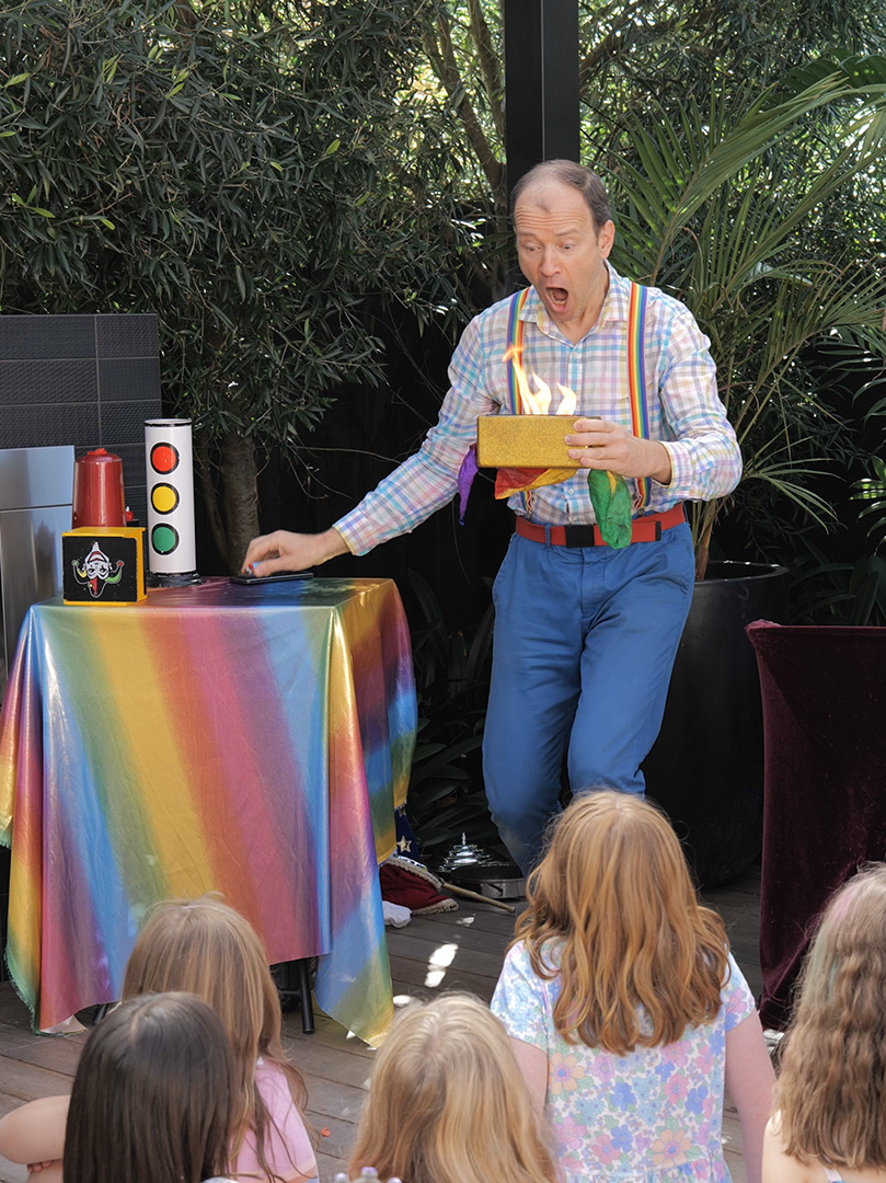 In the GOLD MAGIC SHOW your kids will see great magic tricks with a vanishing cane, magic cylinders, silk in cone, magic traffic light, growing flowers, colourful silks appearing from nowhere, an amazing silks fountain and safe indoor fire magic.